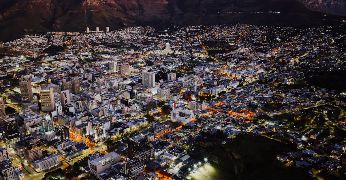 A stunning aerial view of Cape Town city lights at night against Table Mountain.